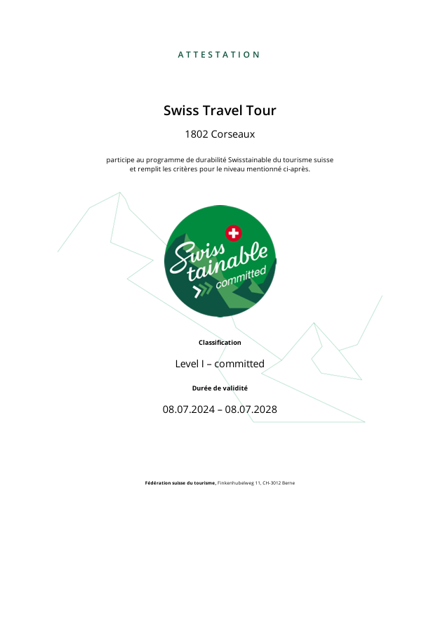 Swiss Travel Tour participe au programme de durabilité "Swisstainable" et nous sommes classés au niveau I – committed.