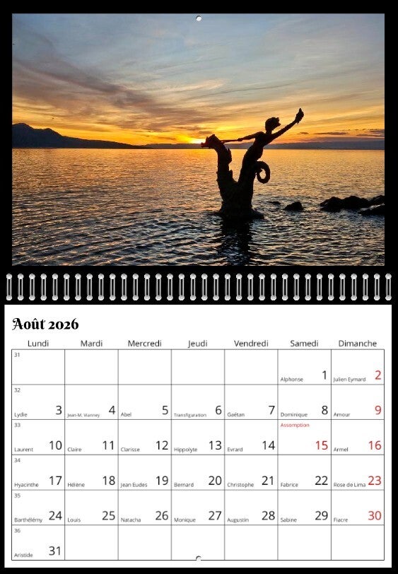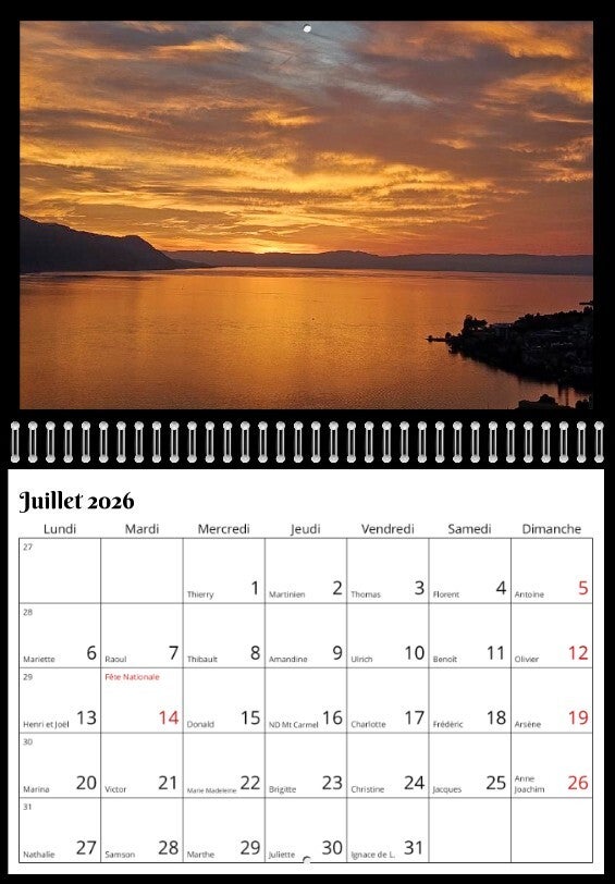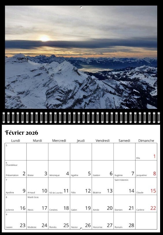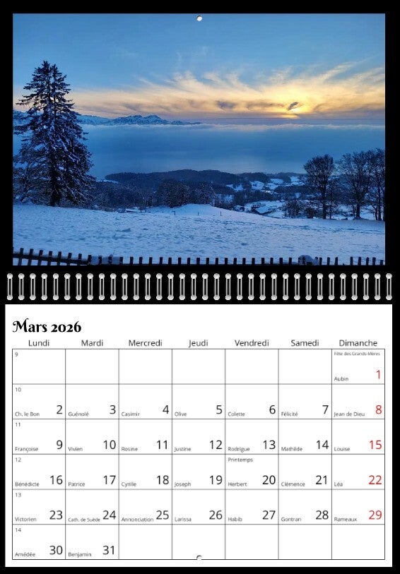 Calendrier photo mural au format A3 avec une sélection de photos de couchers de soleil en Suisse, et suffisamment d'espace pour noter tous vos rendez-vous au fil des mois.